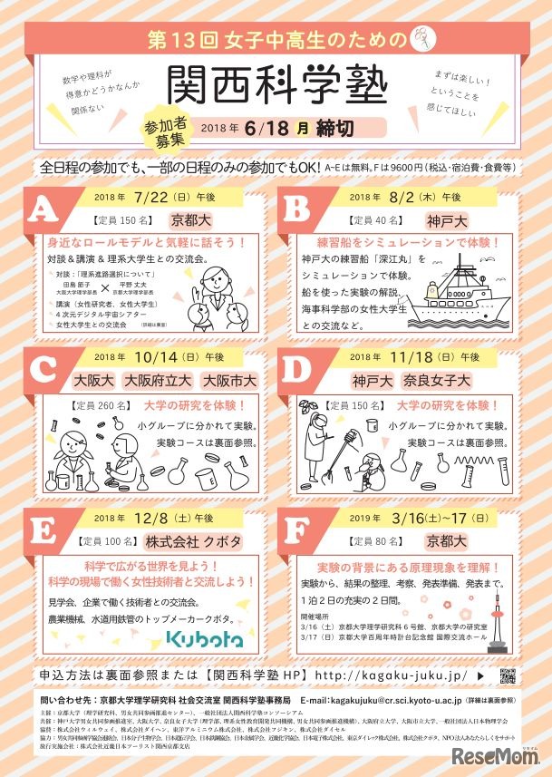 関西の大学が中心となり、女子中高生を対象に理科実験教室などを行う「女子中高生のための関西科学塾」が2018年7月から2019年3月にかけて全6回開催される。全日程の参加はもちろん、一部の日程のみ参加も可能。