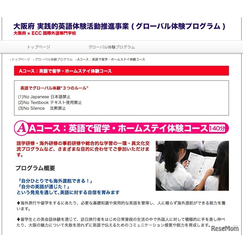 大阪府は2018年5月9日、「グローバル体験プログラム」の募集を開始した。英語の習得意欲向上を目的としたプログラムで、2018年度は府内の高校生に加えて中学3年生も対象とし、全体で2,000人を受け入れる。参加費は無料で、実施期間は5月19日~2019年2月22日。