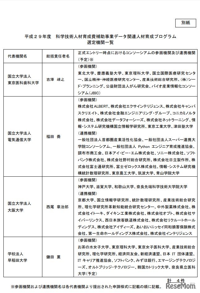 平成29年度 科学技術人材育成費補助事業データ関連人材育成プログラム選定機関一覧