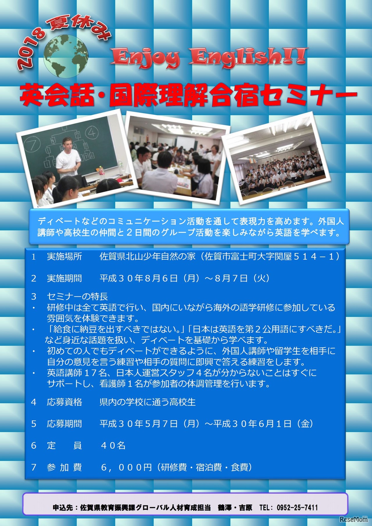 佐賀県教育委員会は2018年6月1日まで、2018年度(平成30年度)「英会話・国際理解合宿セミナー」に参加する佐賀県内の高校生を募集する。実施日は8月6日・7日の1泊2日。参加費は6,000円。