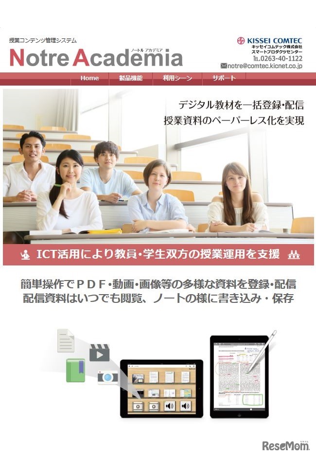 キッセイコムテックは2018年5月14日から、大学など教育機関向け授業コンテンツ管理システム「Notre Academia(ノートル アカデミア)」の販売を開始する。授業教材を一元管理し、学生のiPadに配信することで、教員と学生双方の利便性向上を図る。