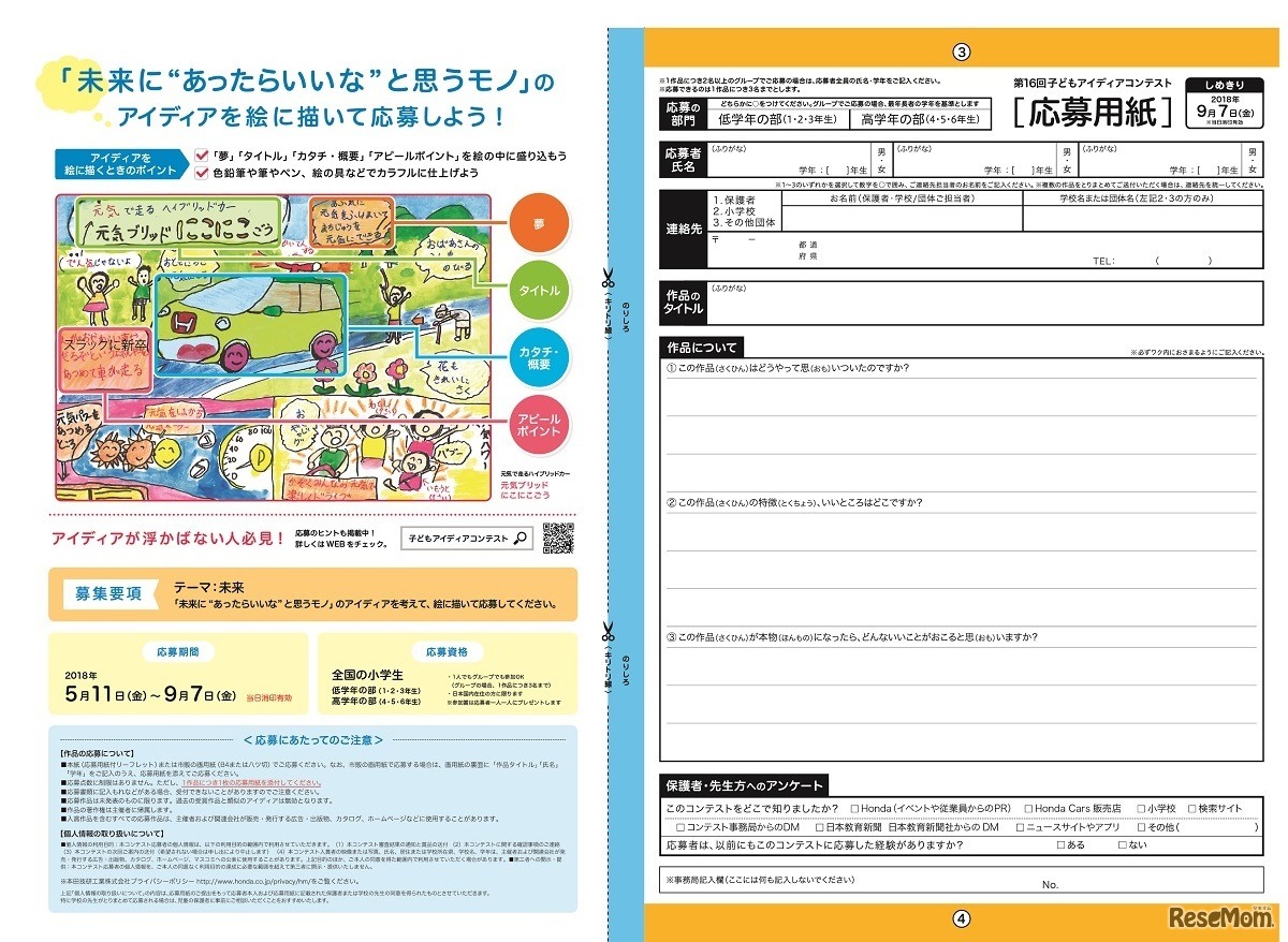 HONDAは、「未来にあったらいいな」と思うもののアイディアを全国の小学生から募集する「第16回 子どもアイディアコンテスト」を開催する。応募期間は2018年5月11日から9月7日まで(消印有効)。