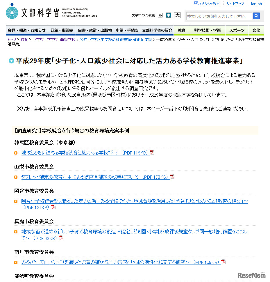 文部科学省は平成30年5月11日、Webサイトに平成29年度「少子化・人口減少社会に対応した活力ある学校教育推進事業」の実施例を掲載した。事業を受託した26自治体における平成29年度の取組みについて紹介している。