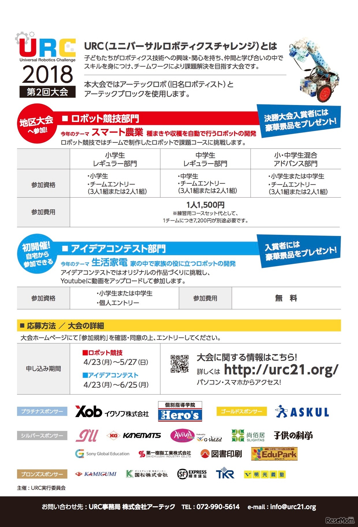アーテックロボを使用した小・中学生のための国際ロボット競技会「Universal Robotics Challenge 2018」が開催される。2018年8月4日から9月2日まで全国8会場で地区大会を開催、9月8日に決勝大会を開催する。今回は初開催となる「アイデアコンテスト部門」も募集。