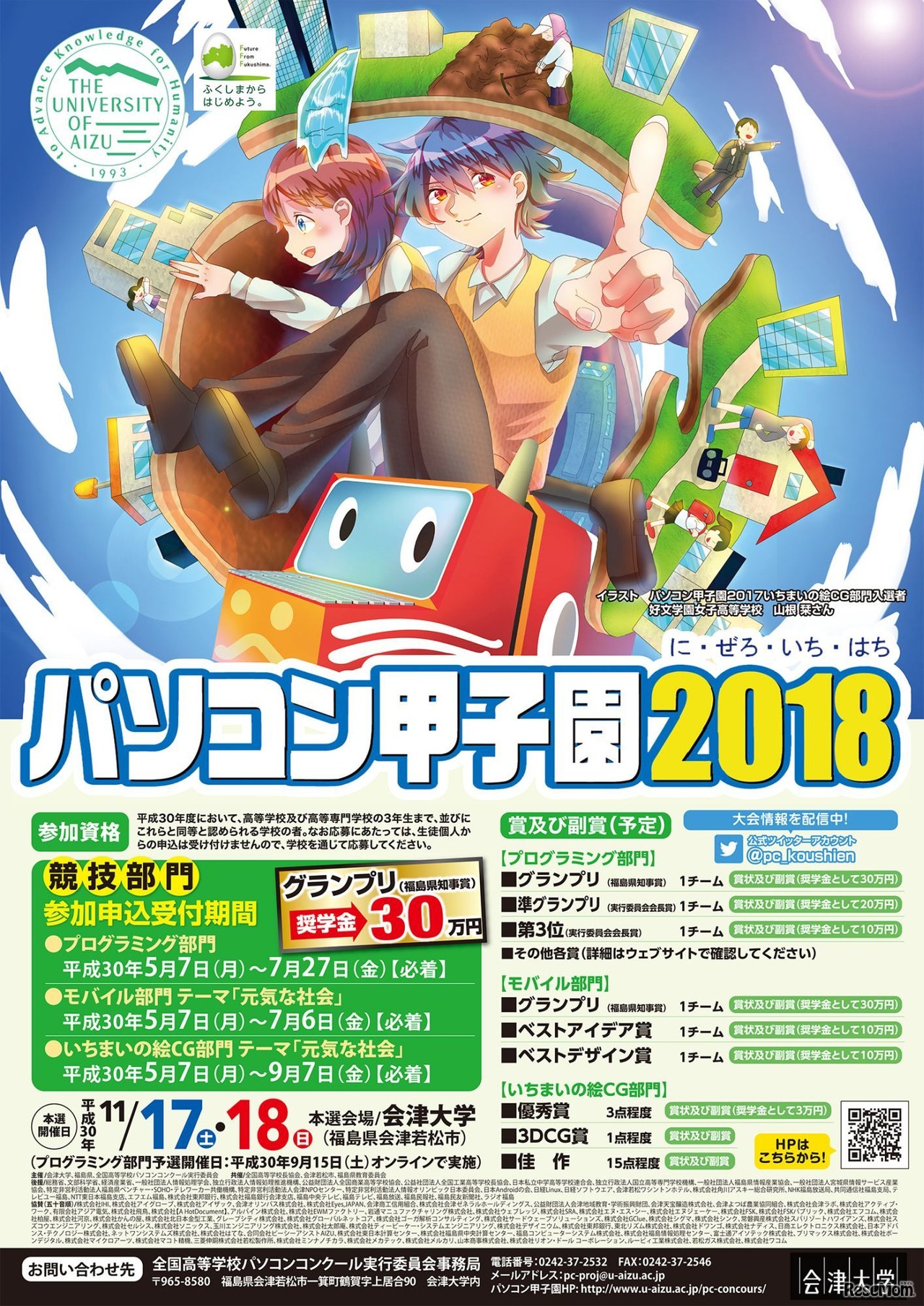 会津大学、福島県、全国高等学校パソコンコンクール実行委員会が主催する「パソコン甲子園2018」では、参加申込および応募作品の受付を行っている。対象は、全国の高校生および高等専門学校生など。本選は、2018年11月17日から18日まで会津大学にて行われる。