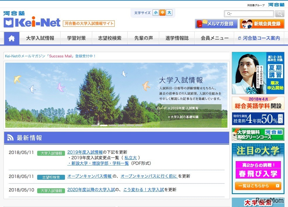 河合塾の大学入試情報サイト「Kei-Net」は2018年5月11日、2019年度入試情報として「私立大学入試変更点」の最新情報を掲載した。早稲田大学教育学部が指定校推薦を導入するほか、社会科学部にて国内高校生も募集範囲とするグローバル入試を実施する。