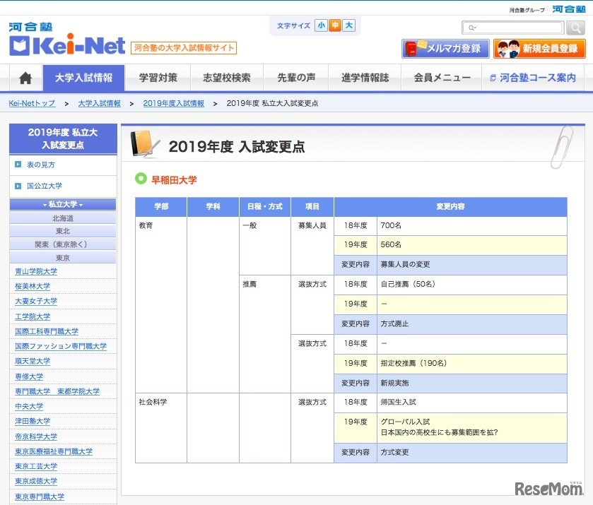 河合塾の大学入試情報サイト「Kei-Net」は2018年5月11日、2019年度入試情報として「私立大学入試変更点」の最新情報を掲載した。早稲田大学教育学部が指定校推薦を導入するほか、社会科学部にて国内高校生も募集範囲とするグローバル入試を実施する。