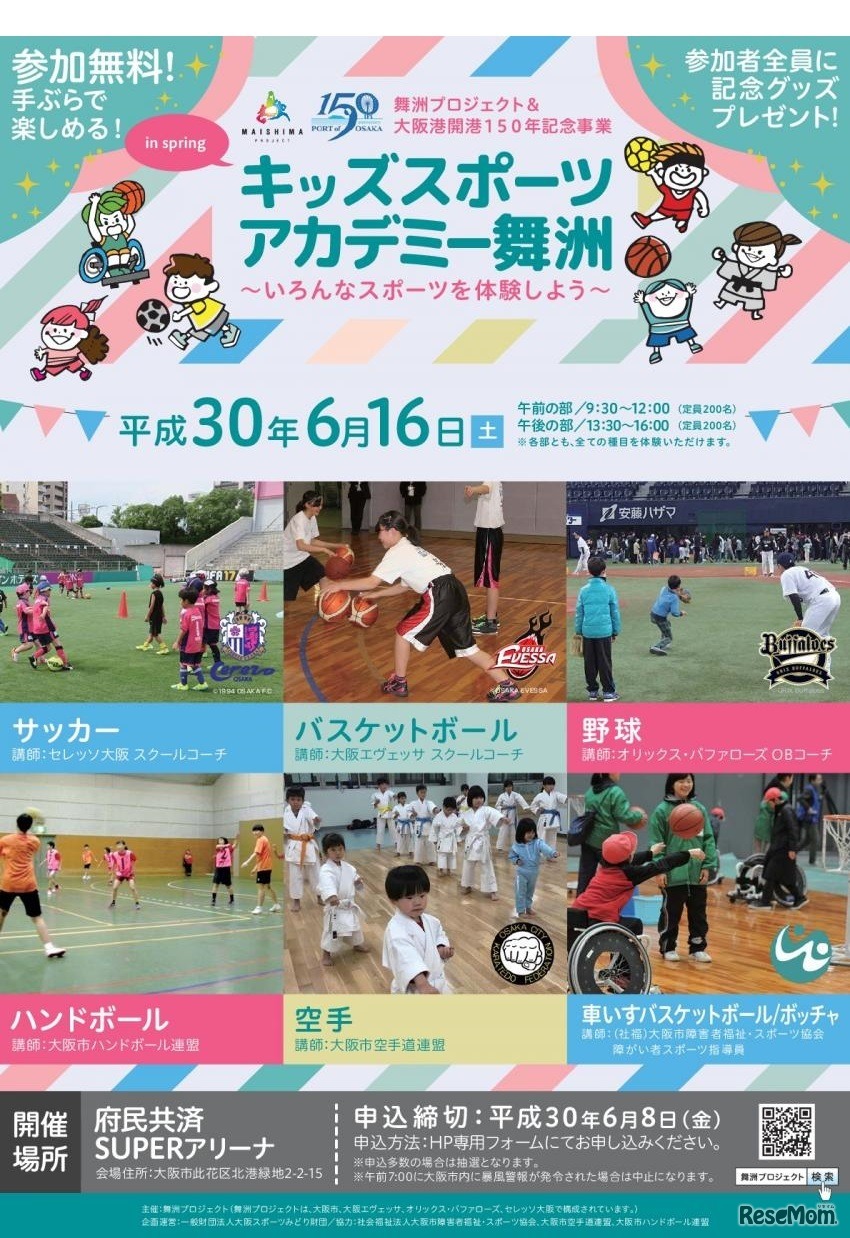 大阪市は平成30年6月16日、大阪をホームタウンとするトップチームやトップアスリートが種目の垣根を越えて子どもたちに交流の場を提供する「キッズスポーツアカデミー舞洲」を府民共済SUPERアリーナで開催する。
