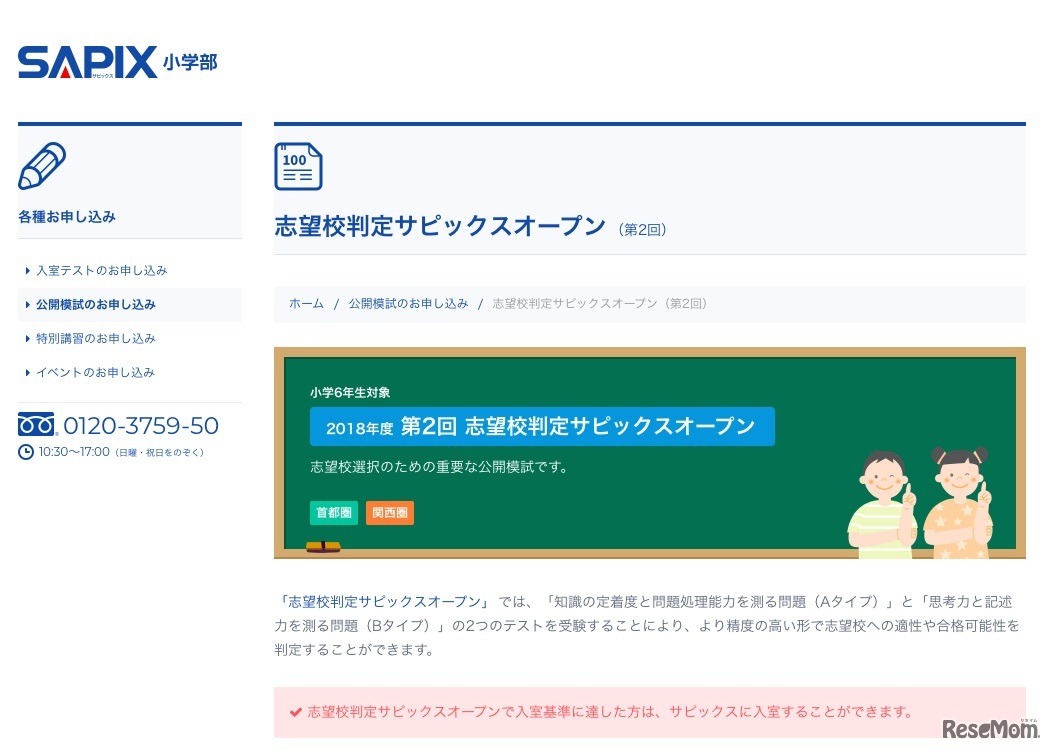 SAPIX小学部は2018年6月3日、小学6年生対象の「志望校判定サピックスオープン」を開催する。テストは算数・国語・理科・社会の4科目で実施され、費用は5,400円(税込)。サピックス生は2018年5月28日午後3時、一般生は6月2日午後3時までに申し込む。
