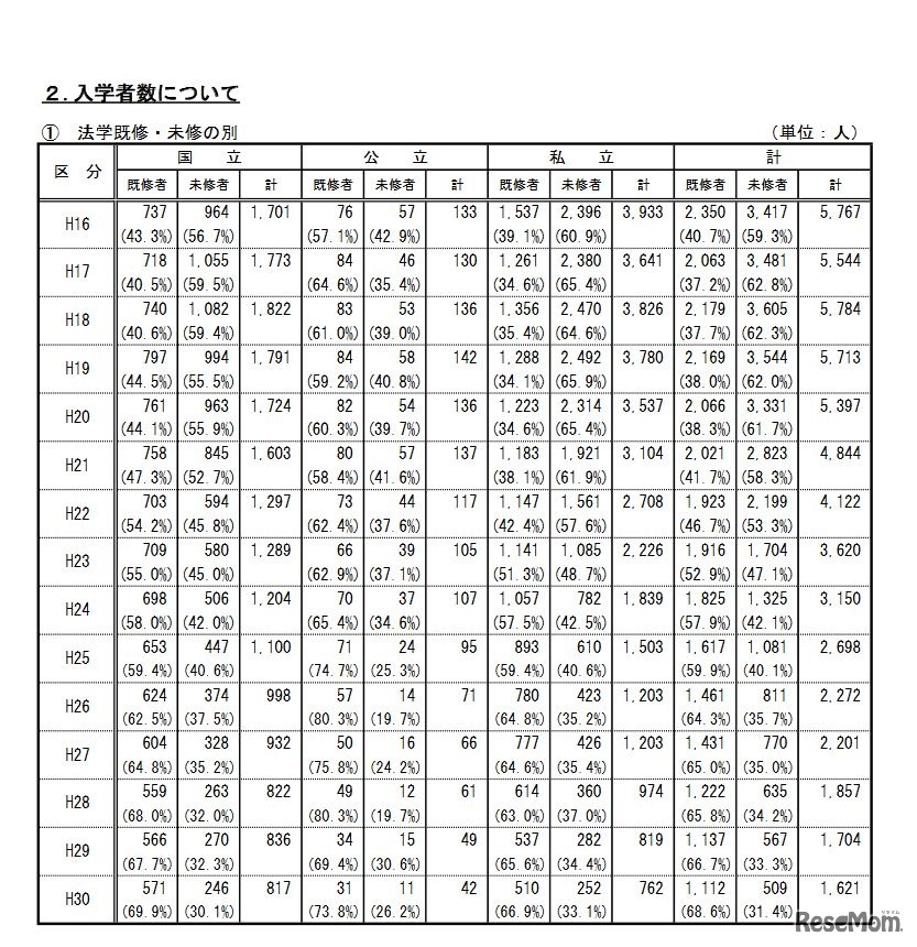 法科大学院の平成30年度(2018年度)の志願者数が前年度比102人減の8,058人と、11年連続で減少したことが平成30年5月14日、第86回法科大学院等特別委員会の配布資料より明らかになった。入学者数も12年連続で減少。志願者、入学者いずれも過去最低を更新した。