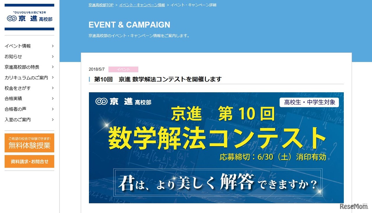 京都・滋賀・愛知を中心に学習塾を展開する京進は、中学生・高校生を対象とした「第9回・第10回 数学解法コンテスト」を開催。オリジナルな発想による解法の美しさと華麗さを競い合う。応募締切は、第9回が2018年5月31日まで、第10回が2018年6月30日まで。