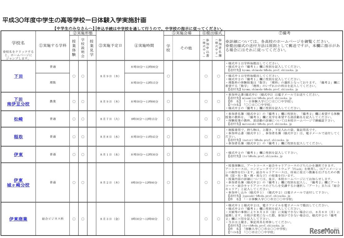 静岡県教育委員会は平成30年5月15日、中学3年生を対象とした公立高校の1日体験入学の概要一覧をWebサイトに掲載した。富士が8月3日、清水東が8月9日など、8月に多数実施される。