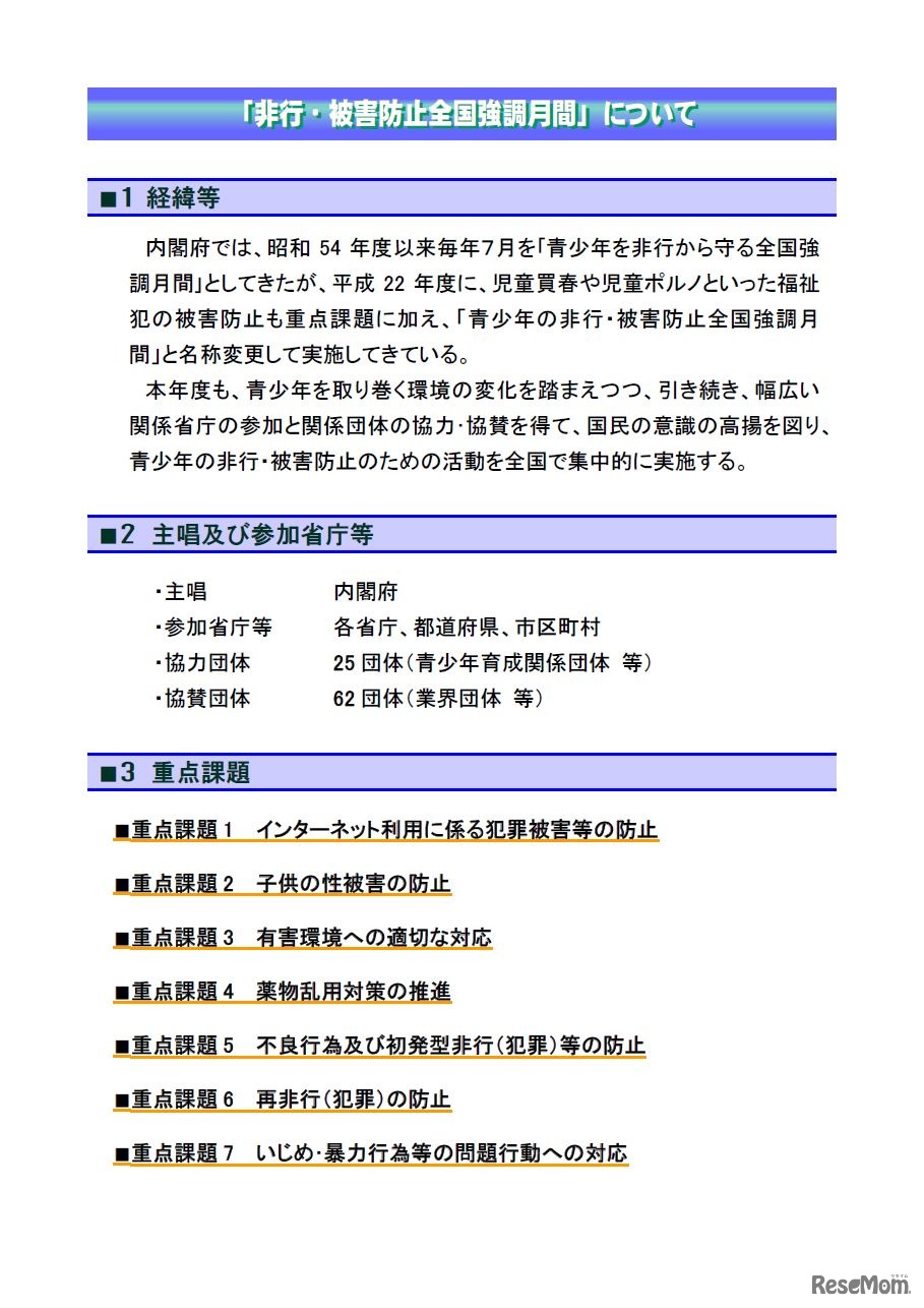 内閣府は毎年7月、学校が夏休みに入る時期にあわせて非行・被害防止活動を展開している。平成30年度の「青少年の非行・被害防止全国強調月間」は平成30年7月1日から31日までの1か月間。