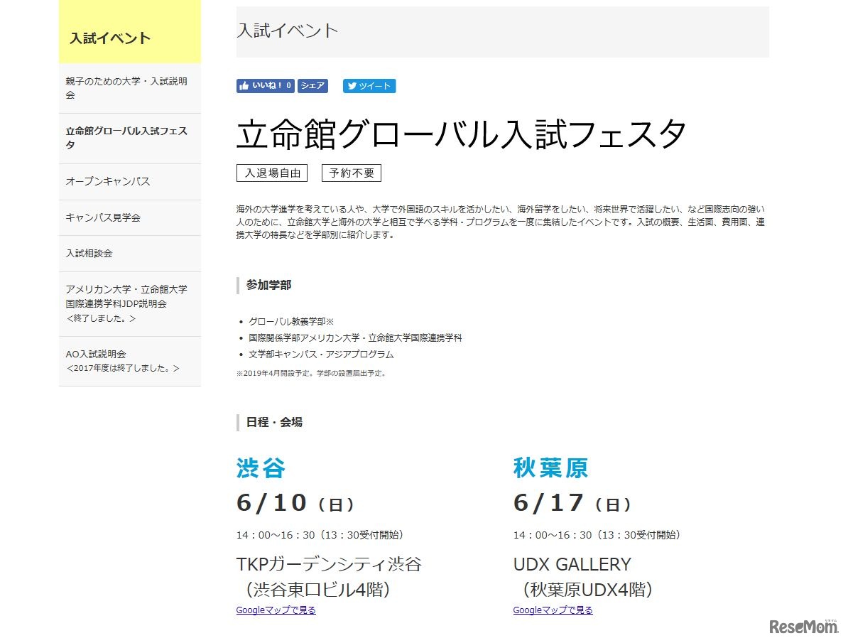 立命館大学は、海外大学への進学を考えている高校生やその保護者を対象とした「立命館グローバル入試フェスタ」を、2018年6月10日に渋谷で、6月17日に秋葉原で開催する。立命館大学と海外大学で相互に学べる3つの学部が集結する入試イベント。予約不要。