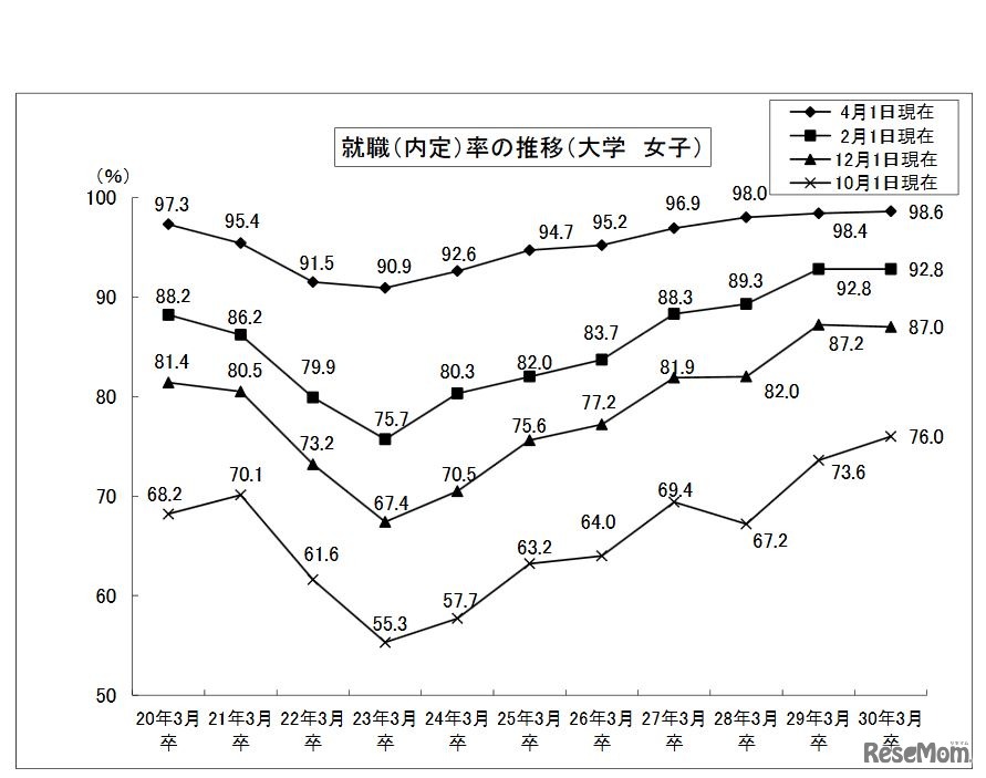 文部科学省と厚生労働省は平成30年5月18日、平成30年3月大学等卒業者の就職状況を発表した。4月1日現在の大学生の就職率は、前年同期比0.4ポイント増の98.0%で、平成9年の調査以来過去最高となった。大学生の就職希望率も75.3%と過去最高を更新した。