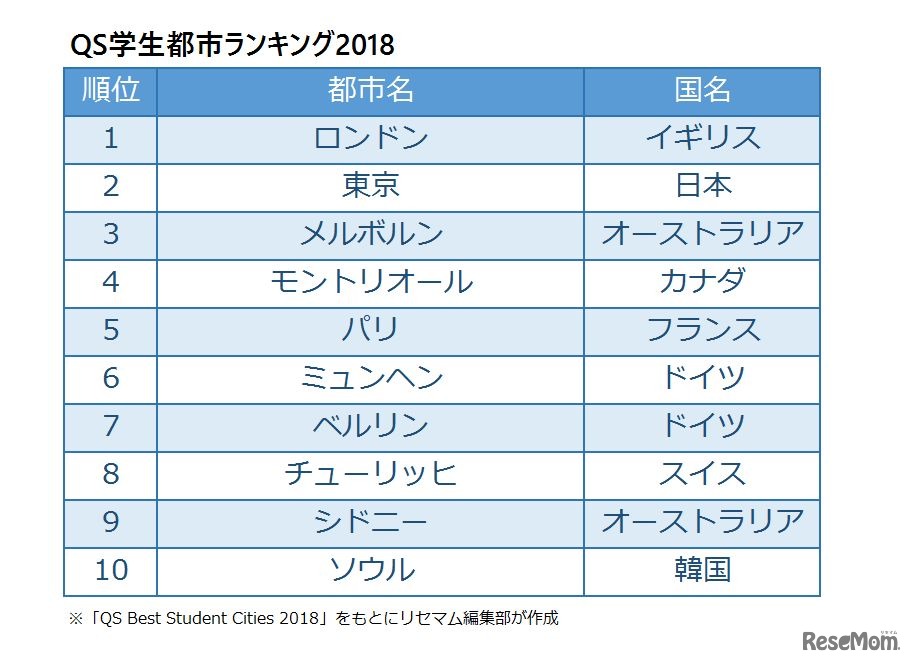 画像:「QS Best Student Cities 2018」をもとにリセマム編集部が作成 QS Best Student Cities 2018(QS学生都市ランキング2018)1~10位