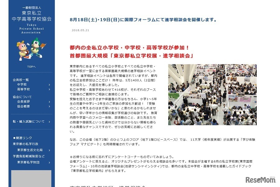 東京私立中学高等学校協会、東京私立初等学校協会、東京都私学財団は2018年8月18日と19日、都内すべての私立小学校・中学校・高等学校が参加する「東京都私立学校展・進学相談会」を開催する。入場無料。