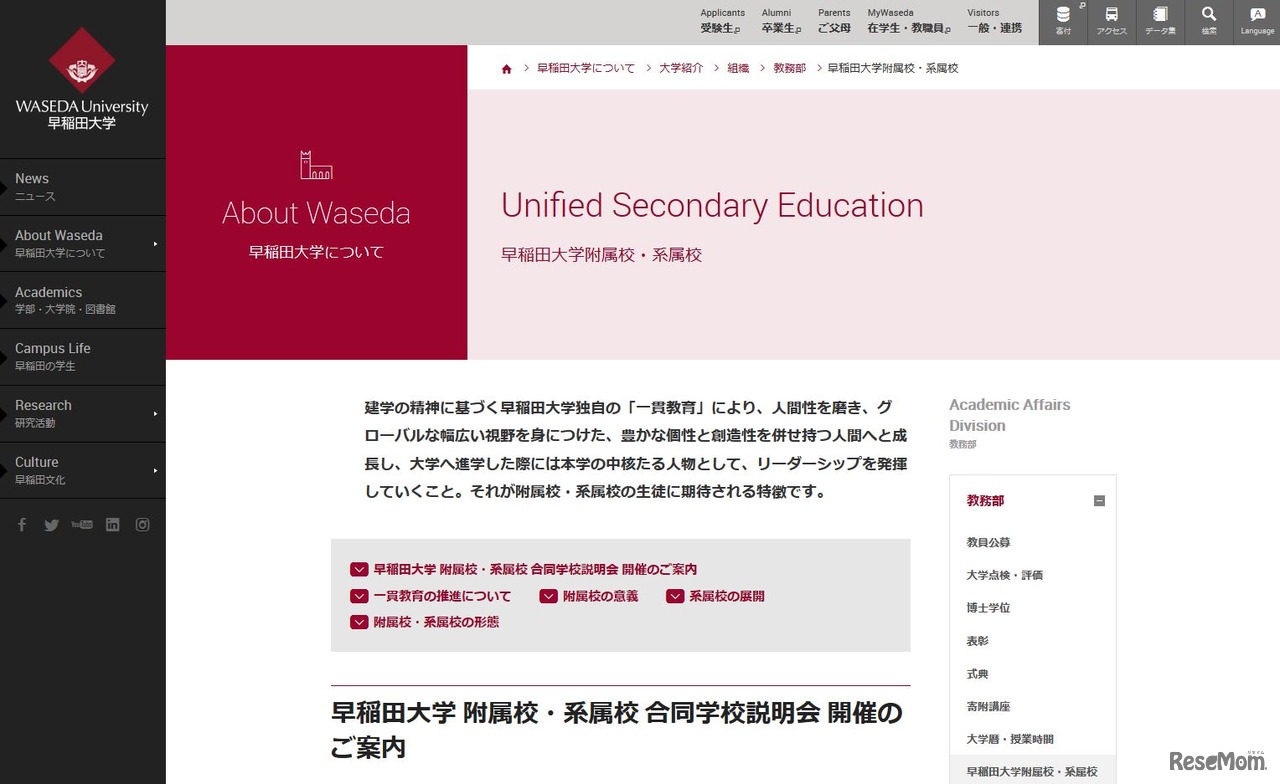 早稲田大学は2018年7月1日、同大の大隈講堂で「附属校・系属校合同学校説明会」を開催する。附属校2校、系属校5校が、早稲田大学が目指す一貫教育、各校の教育内容や特色などについて説明。学校ごとの個別相談会もある。参加無料。事前申込み不要。