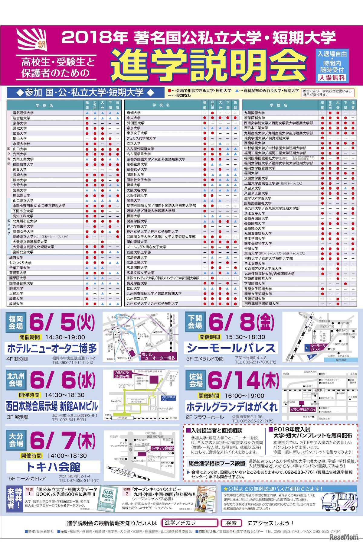 朝日新聞社が主催する「2018年著名国公私立大学・短期大学進学説明会」が、2018年6月に九州・山口地区の9会場にて開催される。各大学の入試担当者と直接相談できるコーナーや、総合進学相談ブースなどを設置。当日は入退場自由、入場無料。