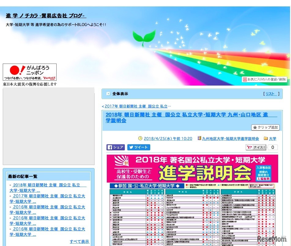 朝日新聞社が主催する「2018年著名国公私立大学・短期大学進学説明会」が、2018年6月に九州・山口地区の9会場にて開催される。各大学の入試担当者と直接相談できるコーナーや、総合進学相談ブースなどを設置。当日は入退場自由、入場無料。