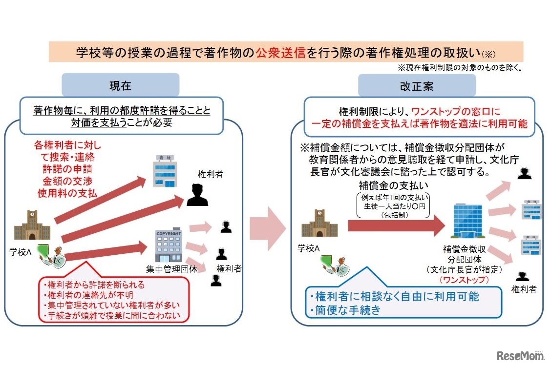 画像出典:文化庁 平成30年3月19日「著作権法の一部を改正する法律案 概要説明資料」 学校等の授業の過程で著作物の公衆送信を行う際の著作権処理の取扱い