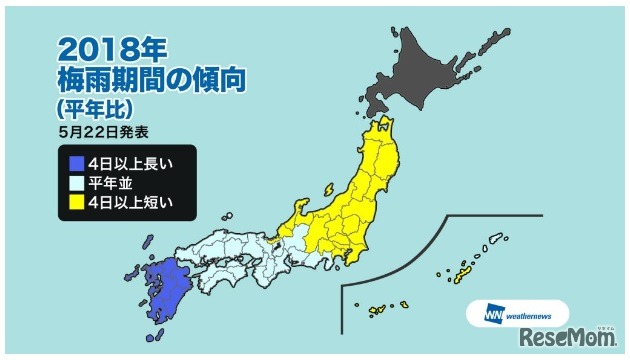ウェザーニューズは2018年5月22日、「梅雨入り・梅雨明け見解」を発表した。2018年は梅雨入り・梅雨明けともに平年より早いところが多い予想。総雨量は広範囲で平年よりやや多めとなり、6月後半から7月上旬は大雨災害にも注意が必要だという。