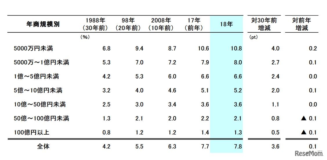 帝国データバンクは2018年5月22日、「女性社長比率調査(2018)」の結果を発表した。2018年4月末時点の女性社長の比率は7.8%。都道府県別では、「青森県」の10.6%がもっとも高く、「岐阜県」の5.2%がもっとも低かった。