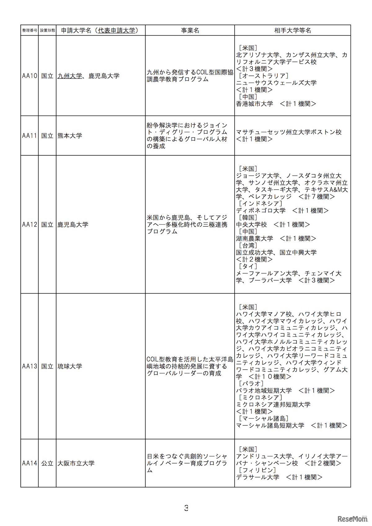 平成30年度大学の世界展開力強化事業「COIL型教育を活用した米国等との大学間交流形成支援」申請大学一覧