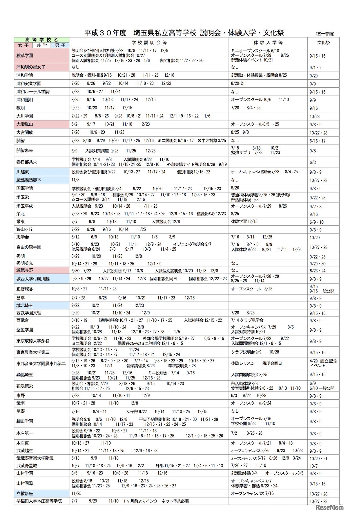 埼玉県私立中学高等学校協会は2018年5月15日、平成30年度における県内私立中学校・高校の学校説明会・体験入学・文化祭のデータを掲載した。一覧は、Webサイト「埼玉私学ドットコム」からダウンロードできる。