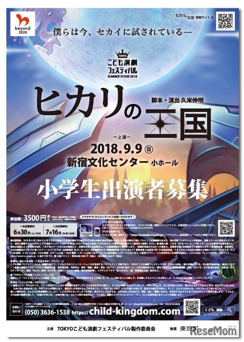東京都が後援する「TOKYOこども演劇フェスティバル」は、小学生だけの舞台「ヒカリの王国」に出演する小学生を全国から募集する。応募期間は、2018年5月23日から7月16日まで。舞台は9月9日に新宿文化センター小ホールで上演される。