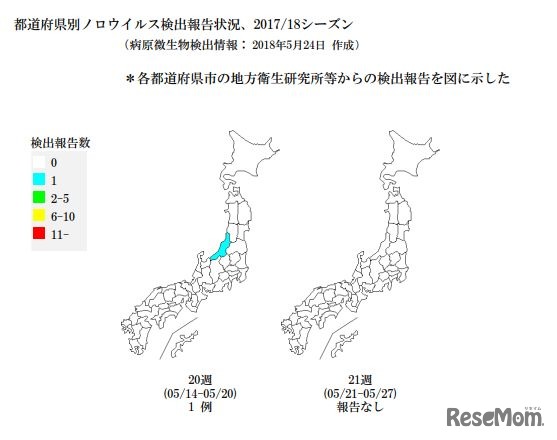 画像出典:国立感染症研究所 都道府県別ノロウイルス検出報告状況(2018年5月14日~5月27日)