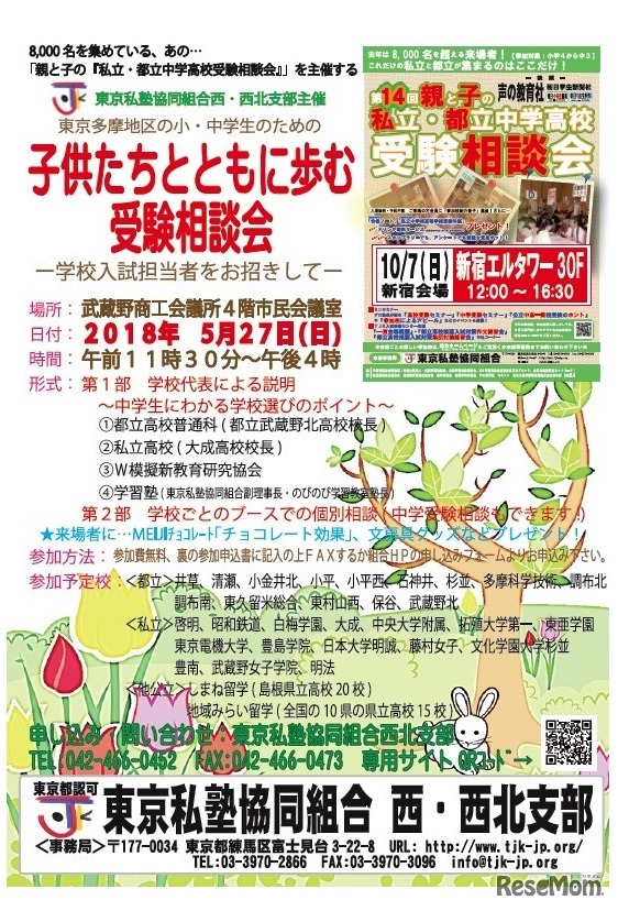東京私塾協同組合西・西北支部は2018年5月27日、「子どもたちとともに歩む受験相談会」を吉祥寺の武蔵野商工会議所で開催する。参加無料。参加申込みはFAXもしくはWebサイトより受け付けている。