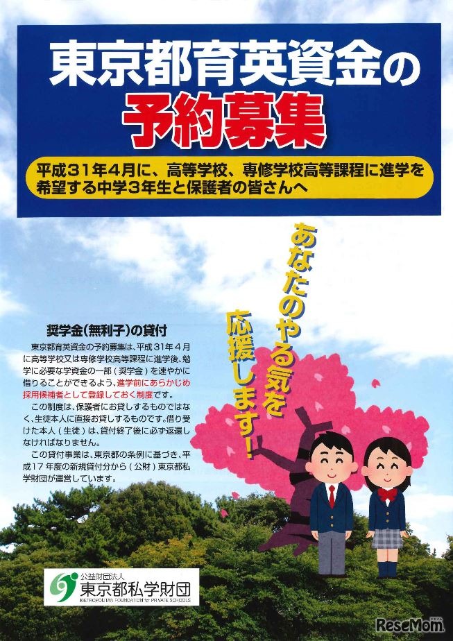 東京都私学財団は、平成31年4月に高校や専修学校高等課程へ進学予定の中学3年生に対し、東京都育英資金の予約募集を行う。奨学生の採用候補者予定数は700名程度。月額(予定)で国公立1万8,000円、私立3万5,000円を無利子で貸し付ける。
