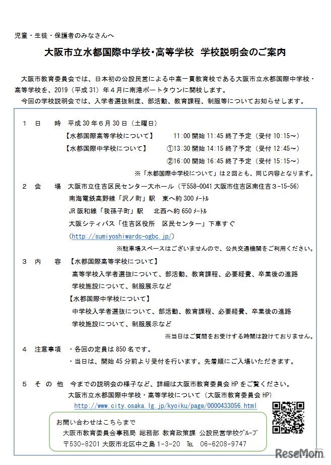 大阪市教育委員会は、日本初の公設民営による中高一貫教育校として、平成31年(2019年)4月南港ポートタウンに開校する大阪市立水都国際中学校・高等学校の学校説明会を平成30年6月30日に開催する。入学者選抜制度や教育課程などについて説明する。事前申込不要。