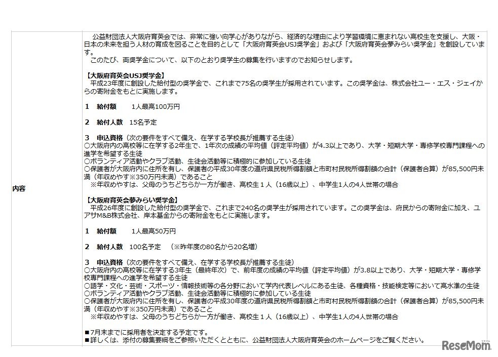 大阪府育英会は、強い向学心がありながら経済的な理由により学習環境に恵まれない高校生を支援するため、平成30年度(2018年度)の「大阪府育英会USJ奨学金」および「大阪府育英会夢みらい奨学金」奨学生を募集する。