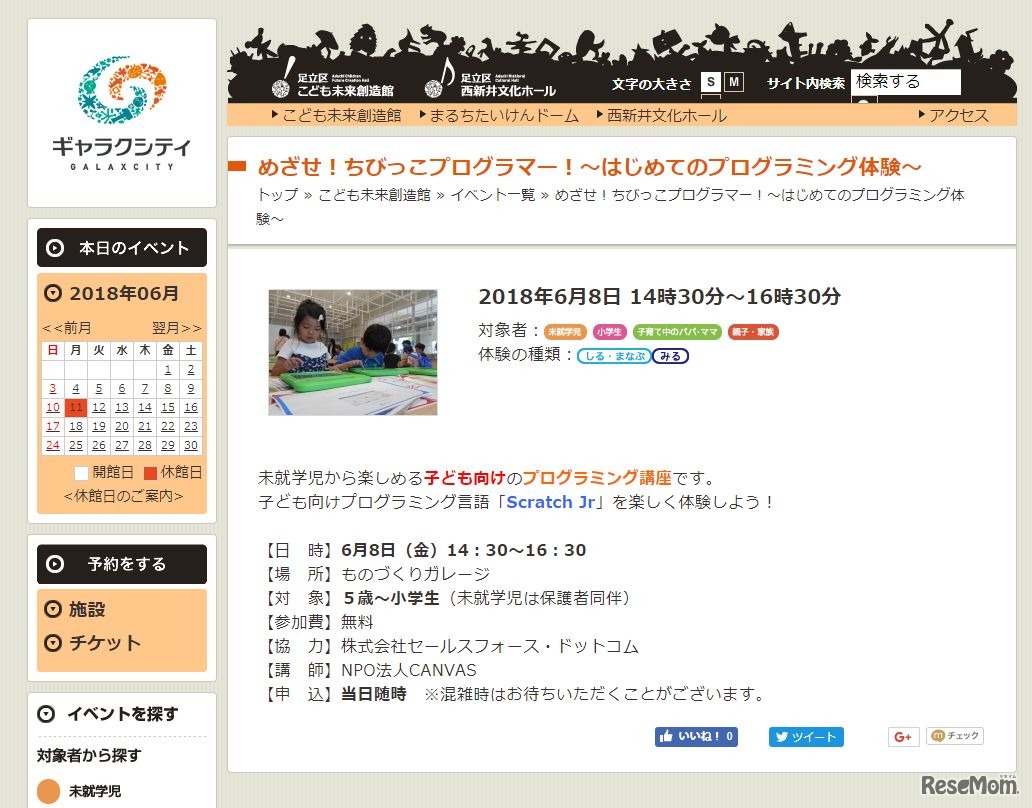 5歳から小学生を対象としたプログラミング講座「めざせ!ちびっこプログラマー!」が東京都足立区にあるギャラクシティで月に1回開催されている。2018年度は、6月8日、7月13日、8月10日、9月21日、10月以降は第2金曜日に開催予定。