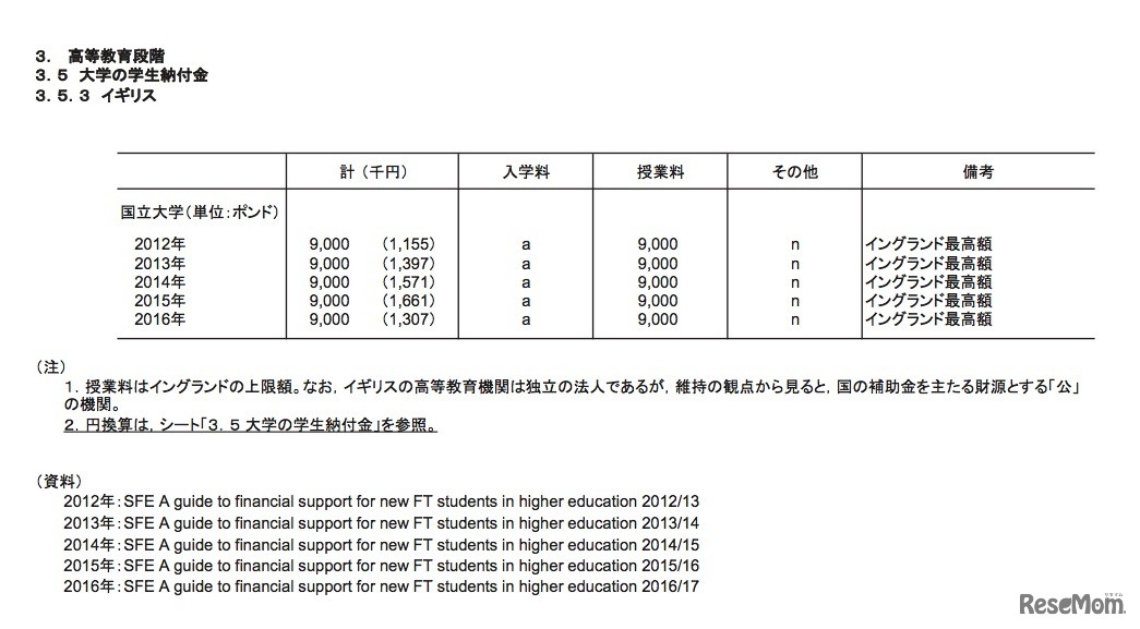 画像出典:文部科学省 平成30年(2018年)版「諸外国の教育統計」 大学の学生納付金(イギリス)