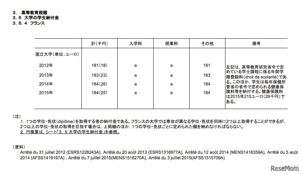 画像出典:文部科学省 平成30年(2018年)版「諸外国の教育統計」 大学の学生納付金(フランス)