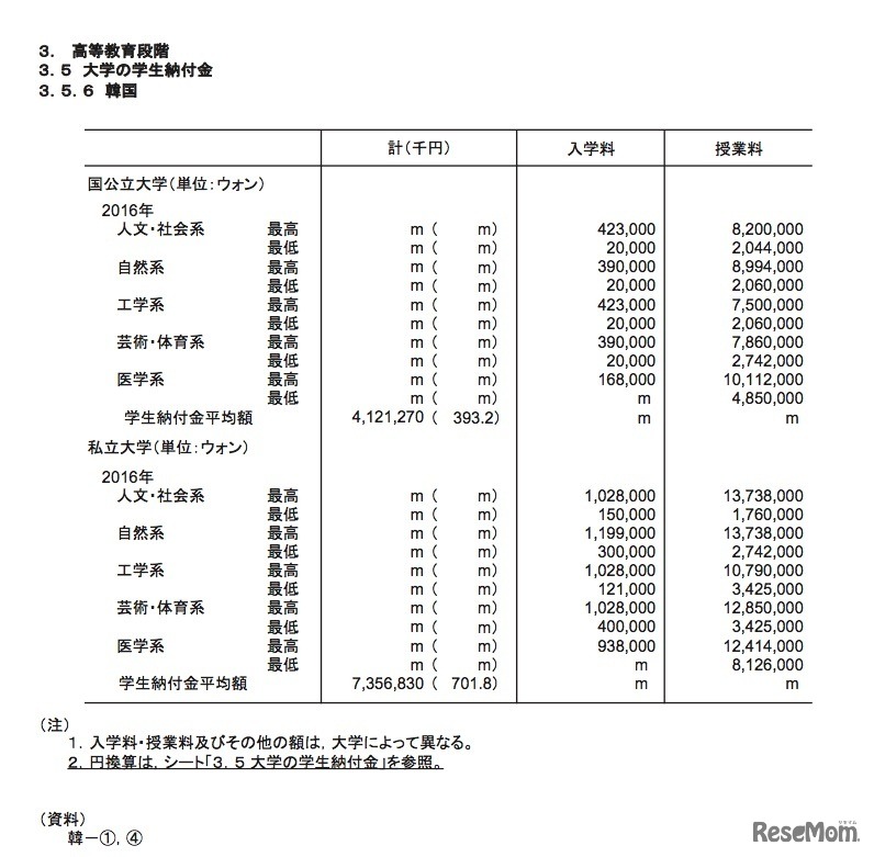 画像出典:文部科学省 平成30年(2018年)版「諸外国の教育統計」 大学の学生納付金(韓国)