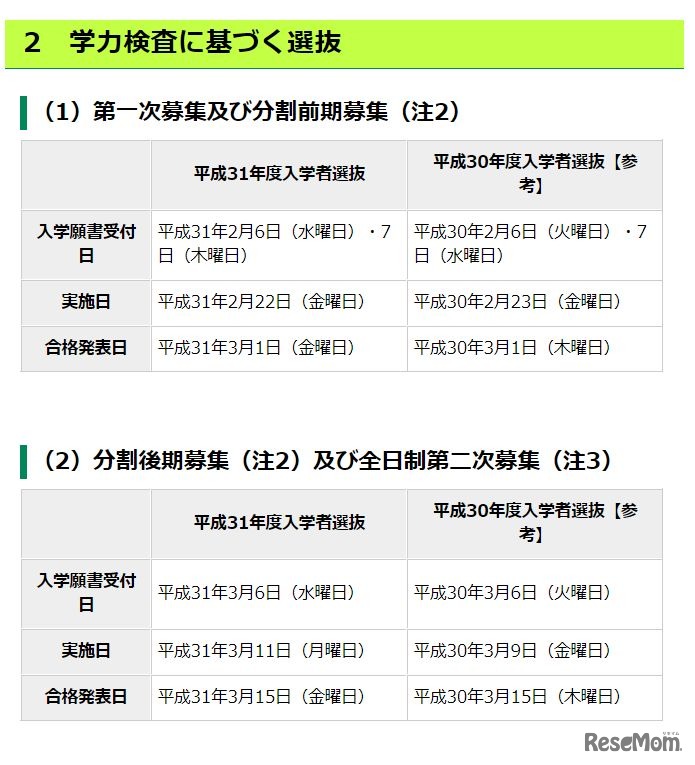 東京都教育庁は平成30年5月24日、平成31年度(2019年度)東京都立高等学校入学者選抜の日程を発表した。選抜実施日は、推薦が平成31年1月26日と27日、第一次募集と分割前期募集の学力検査が2月22日。