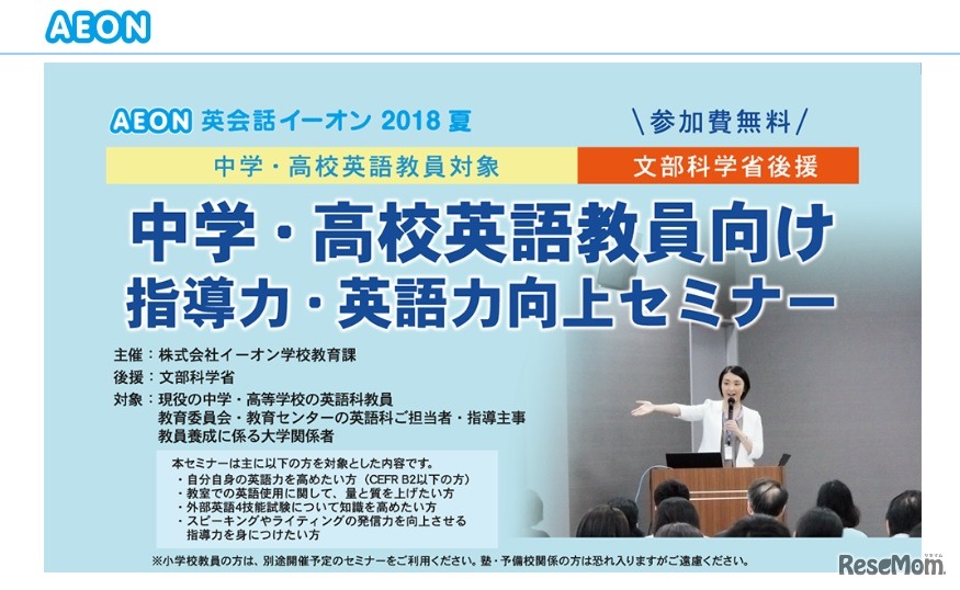 英会話教室を運営するイーオンは、「中学・高校の英語教員向け 指導力・英語力向上セミナー」を2018年7月27日に東京、8月1日に札幌、8月7日に名古屋、8月17日に福岡、8月21日に広島、8月22日に大阪で開催する。参加費は無料。