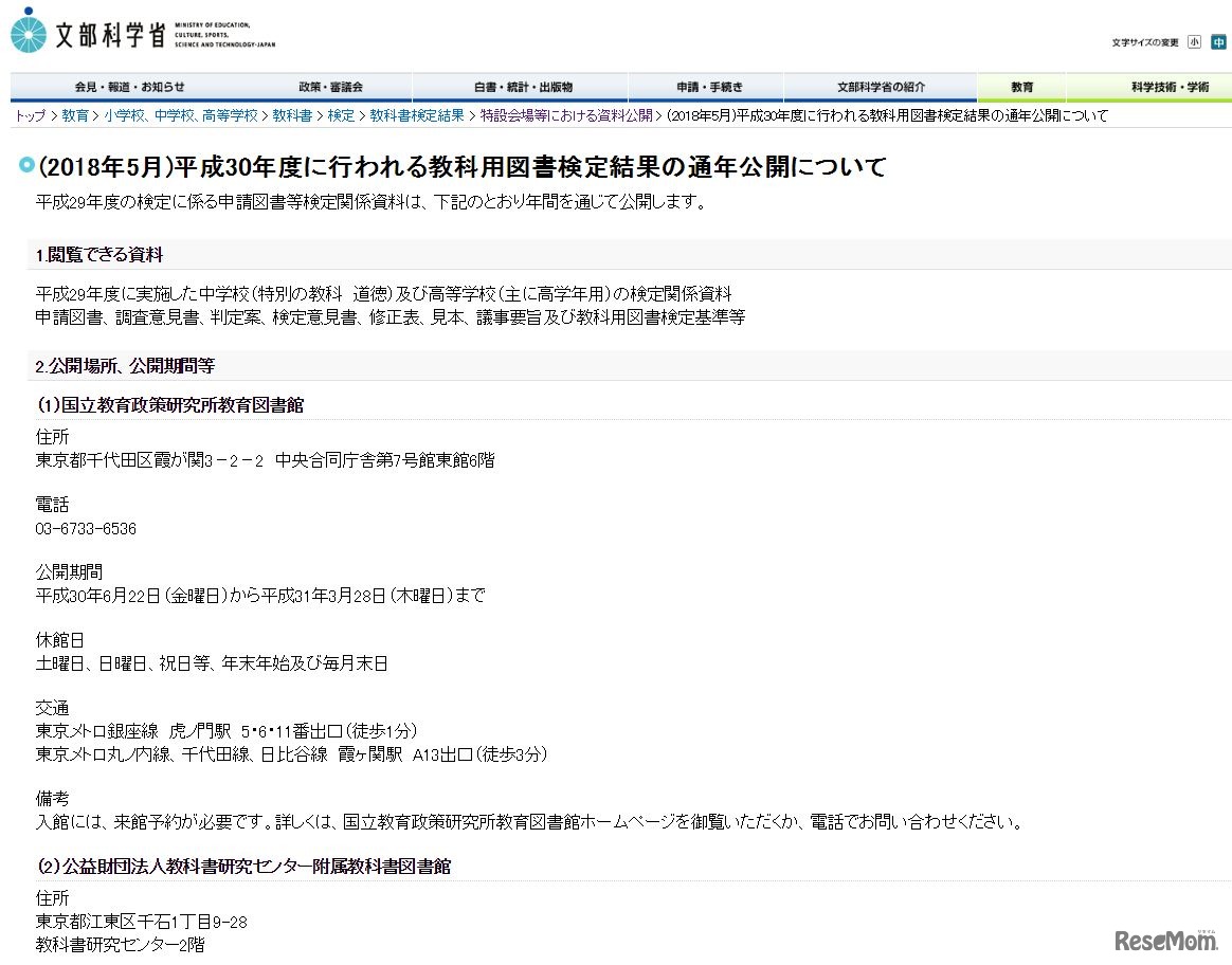 文部科学省は平成30年5月29日より、東京都内の教科書研究センターを皮切りに、全国8会場で平成30年度の教科書用図書検定に関する資料を公開する。このうち東京の2会場では年間を通じて公開する。