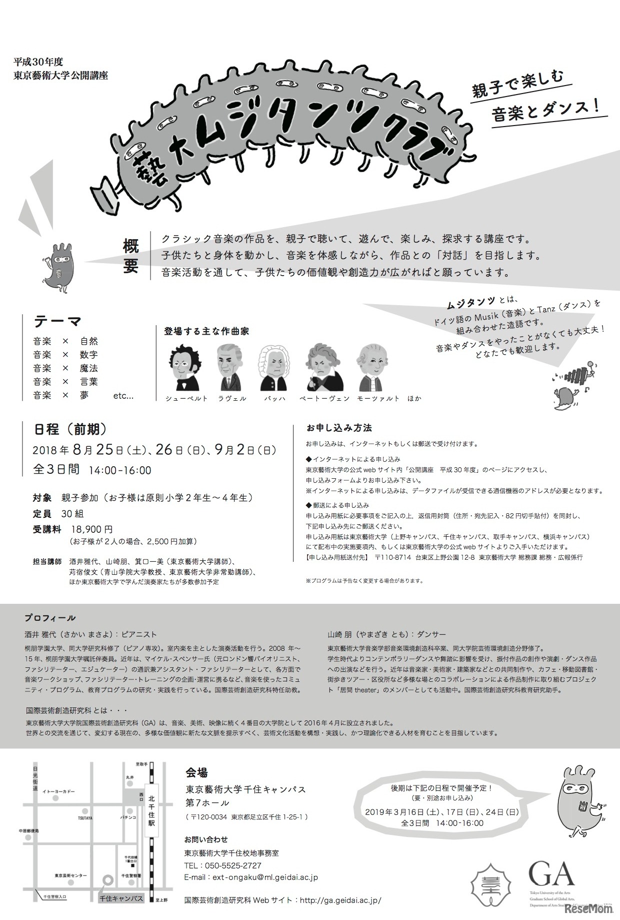 東京藝術大学国際芸術創造研究科は、2018年度前期、後期の各3日間、公開講座「藝大ムジタンツクラブ」を開講する。クラシック音楽を題材に親子で音楽とダンスを楽しむ講座で、対象は原則小学2年生から4年生の親子。6月30日まで前期分の申込みを受け付けている。