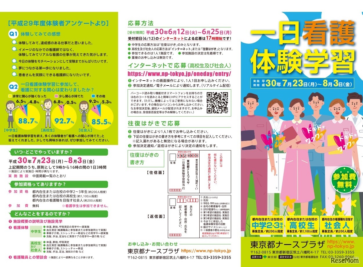 東京都は、2018年7月23日から8月3日にかけて実施する「一日看護体験学習」の参加者を募集している。対象は、都内在住または在校の中学2・3年生、高校生および都内在住の看護職を目指す社会人。募集期間は6月12日午後5時から6月25日午後5時まで。参加無料。