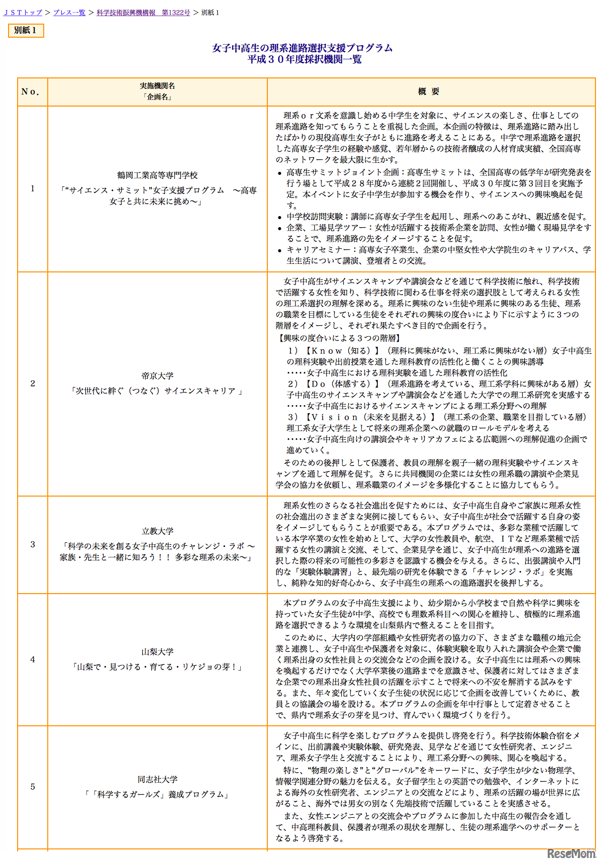 科学技術振興機構(JST)は平成30年5月29日、「女子中高生の理系進路選択支援プログラム」の平成30年度採択機関を発表した。応募21件から、立教大学や同志社大学、鶴岡工業高等専門学校など10機関が選定された。