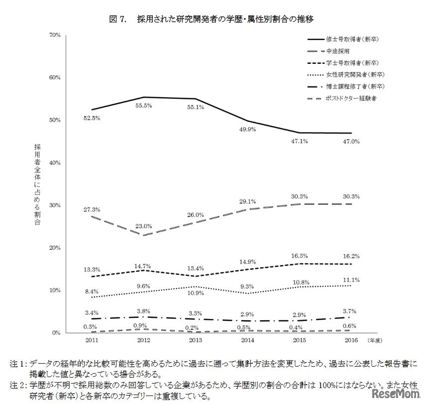 画像出典:科学技術・学術政策研究所 2018年5月30日「民間企業の研究活動に関する調査報告2017」 採用された研究開発者の学歴・属性別割合の推移