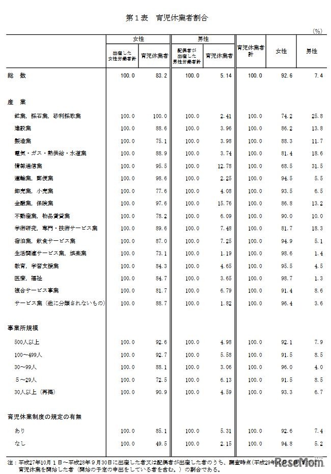 厚生労働省は平成30年5月30日、「平成29年度雇用均等基本調査(速報版)」の結果を公表した。男性の育児休業取得率は、前年度比1.98ポイント増の5.14% と、5年連続で上昇し、過去最高となった。女性の育児休業取得率は、前年度比1.4ポイント増の83.2%であった。
