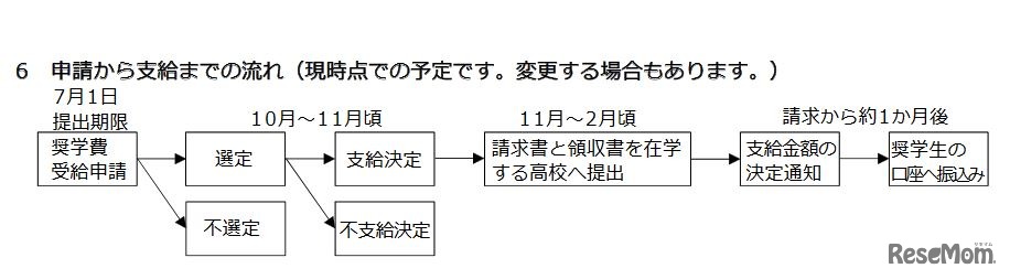 画像出典:大阪市「平成30年度大阪市奨学費奨学生募集要項」 申請から支給までの流れ(予定)