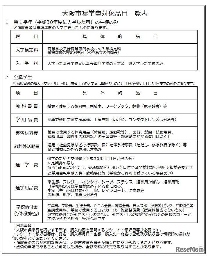 大阪市は、経済的な理由で修学が困難な高校生らのための奨学金「大阪市奨学費」の平成30年度奨学生を募集している。奨学生は、入学や学校教育に要した費用について、領収書などとともに請求し、支給上限額まで受給できる。申込締切は平成30年7月1日。