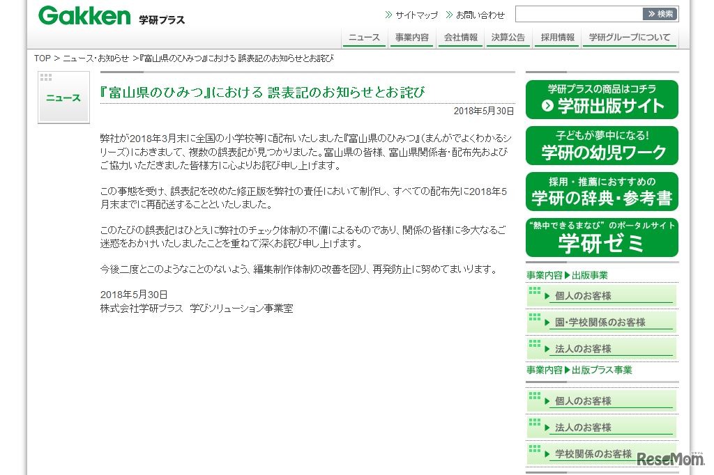 学研プラスは2018年5月30日、同年3月末に全国の小学校などに配布した「富山県のひみつ」(まんがでよくわかるシリーズ、同社発行)に複数の誤表記があったと発表した。